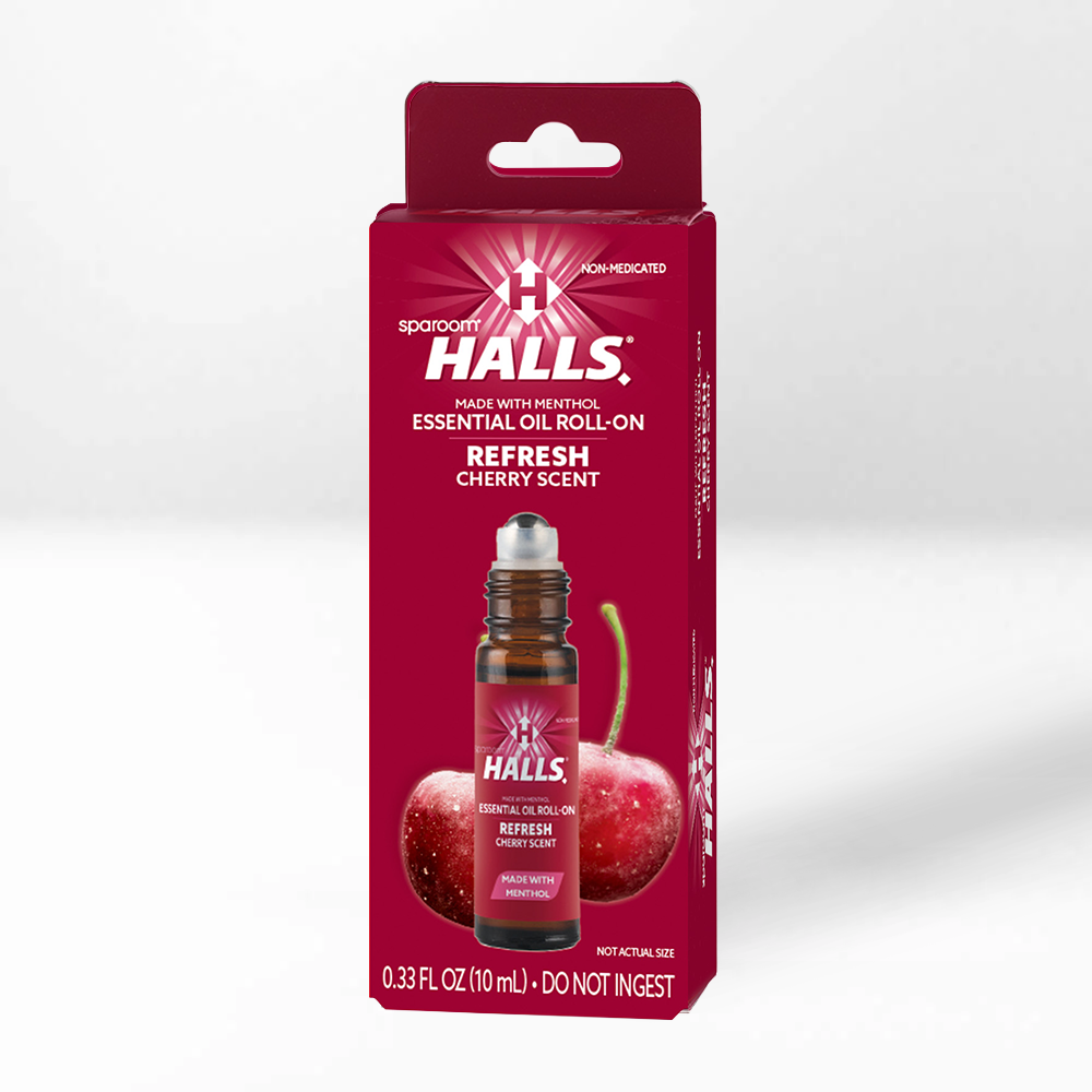 The sparoom® HALLS® Cherry Aromatherapy Roll-On: Featuring the classic cherry-inspired scent and 100% pure essential oil with menthol, this roll-on delivers a refreshing and uplifting aroma. A versatile choice for enhancing your daily moments with a touch of rejuvenation.