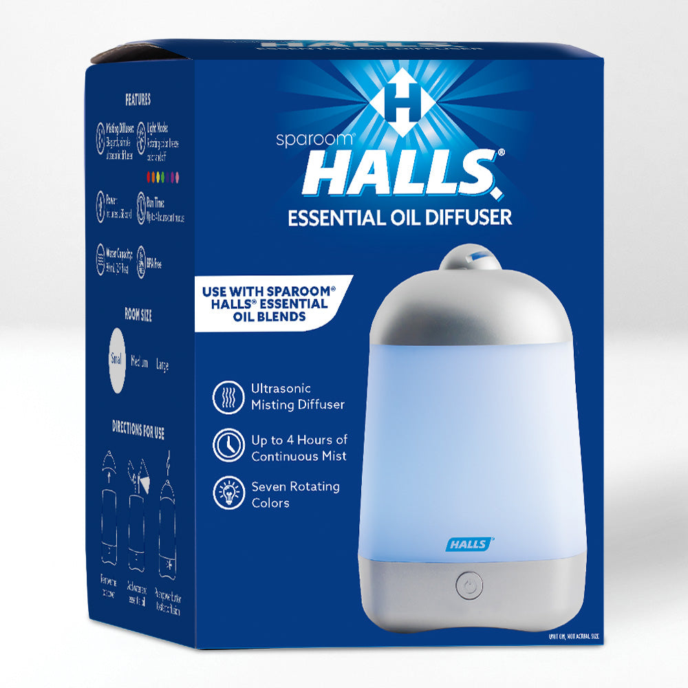The sparoom® HALLS® Mini SpaMist Essential Oil Diffuser is an elegantly simple ultrasonic diffuser that fills your space with refreshing aromas. Included is the HALLS Mentho-Lyptus Essential Oil Blend, crafted with essential oils and menthol, delivering a soothing and invigorating scent to refresh your senses.